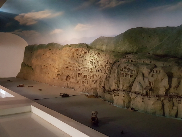 千佛崖复原图;民国政府修筑川陕公路的时候毁掉了右半部分修有栈道的崖壁佛像