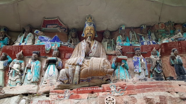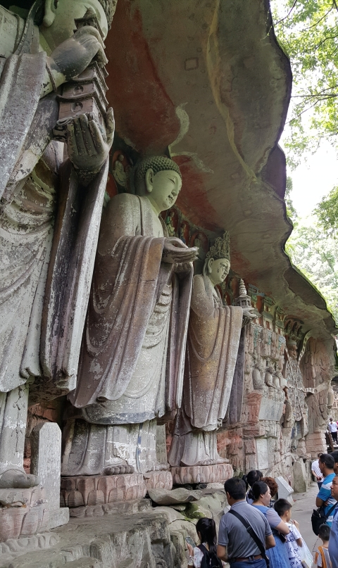 大足石刻是一个统称,包含了很多当地的石刻群,其中不少含有释道儒三教合流的作品。这些石刻群里最有名的当属宝顶山摩崖造像,其主体是唐末宋初的佛教造像。这个造像群实在太异类,给我留下的印象只能用震惊两字来形容。自从膜拜了龙门、云冈、千佛崖这些传世的经典,看过了大小寺庙里的各类佛像,多少有点审美疲劳,觉得这些佛像大都雷同,像一个模子里塑出来的。来到宝顶山,眼前却陡然一亮:佛像竟然还可以这样雕刻啊?!