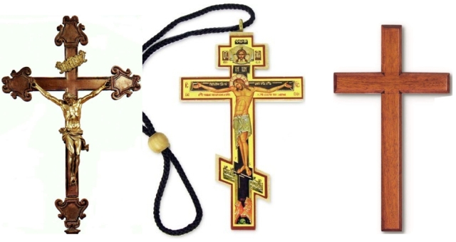 基督教的十字架,从左往右依次是:天主教(主要分布在南欧和南美);东正教(主要分布在东欧和俄罗斯);新教(主要分布在西欧和英美),由立体向平面转变。