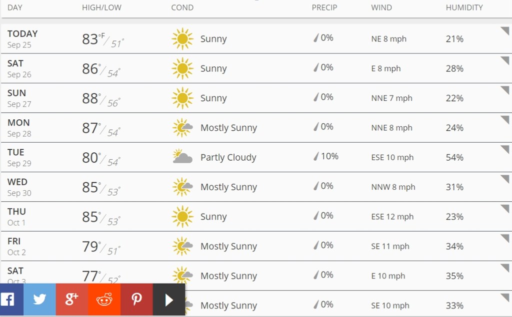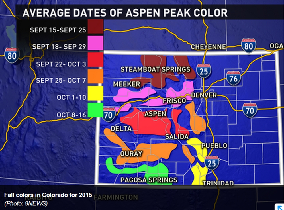 九月末是观赏黄叶的时节。科罗拉多的白杨(或者白桦,我分不清它们间的区别)在北美是很出名的。虽然这里只有白杨而鲜有枫树,看不到北边密西根、新英格兰或者加拿大那种铺天盖地的红叶,但是满山尽带黄金甲的景色也同样震撼人心。可惜天底下大凡美好的东西,不易长久保留,往往转瞬即逝。最好看的秋景都藏在了大山深处,而山里面的白杨基本上每年的九月中旬开始变黄,十月初瑟瑟秋雨一阵袭来就全都落光光。所以适合看黄叶的时间不过前后一两周光景。因为纬度差异,从北到南落叶的时间不太一样。南边比北边要晚一点,通常相隔数周。这张图显示科州各地区适合看黄叶的不同日期。