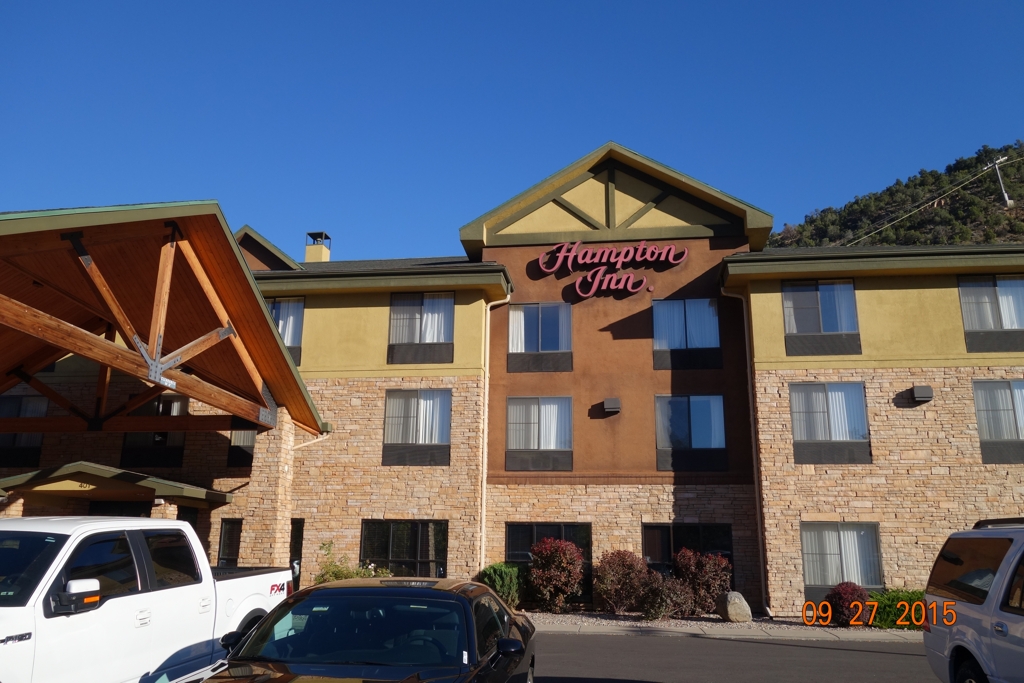 不得已,只好在离小镇一个小时车程远的Glenwood Springs订了酒店,价格也不便宜,一天两百刀。以往每次出游都住假日酒店。住得实在太多,有点腻了,这次想换个酒店试试。这个Hampton Inn跟假日酒店应该是同一档次,若在淡季,也就100出头吧。