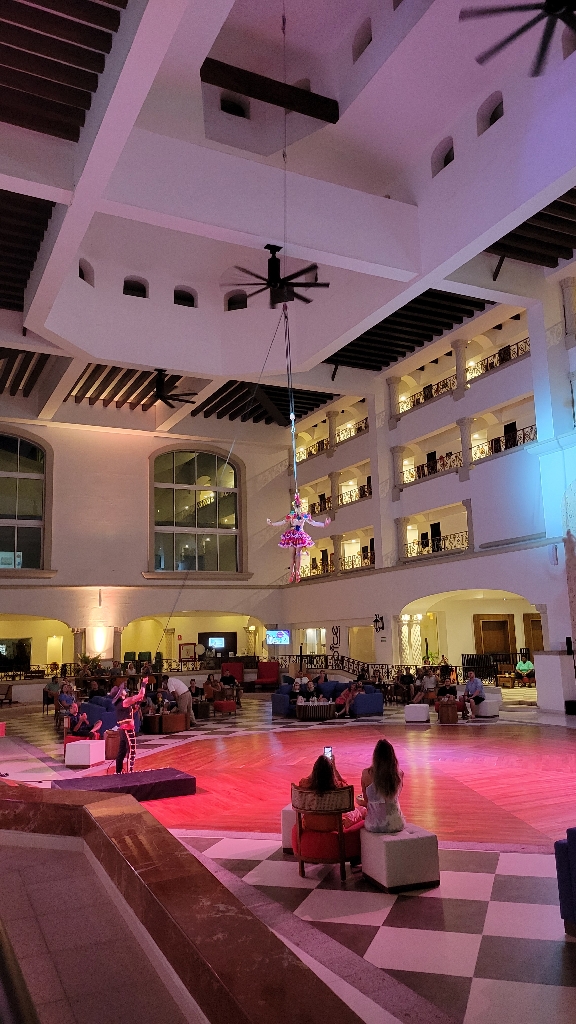 酒店大厅里每天晚上都有娱乐表演可看,墨西哥传统歌舞、器乐演奏还有杂技。