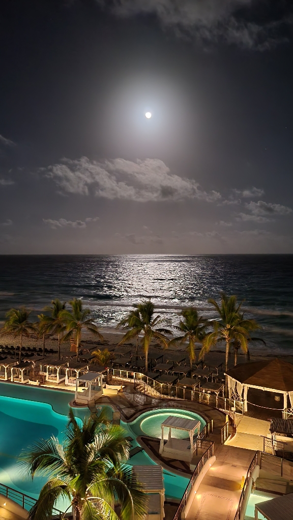 入住的头天晚上皓月当空,真真切切体验了一把海上升明月的美景。“明月何皎皎,照我罗床帏”,面对撩人的夜色,情不自禁放声吟诵了两遍苏轼的《明月几时有》,还有秦观的《纤云弄巧》。