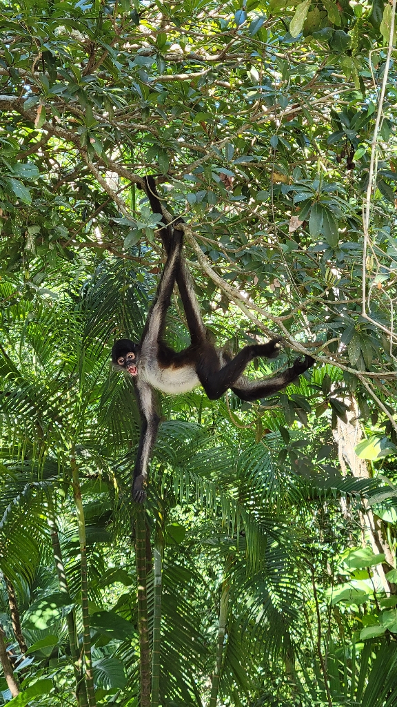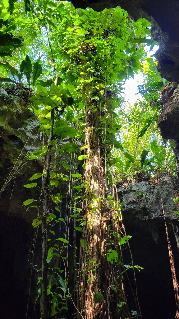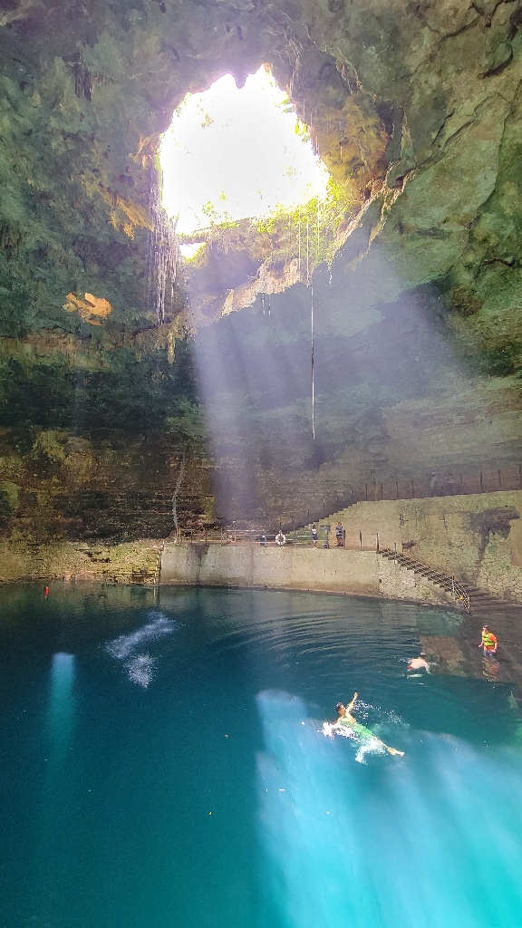 天坑(cenote)是墨西哥的又一大特色。小红书上说整个墨西哥拥有六千多个天坑。大约是因为那里的地质是石灰岩的缘故,地表水渗入到地下,日长月久溶蚀形成大大小小各种溶洞,然后由于各种原因洞顶塌陷,从而形成充满水的天坑。因为水里溶有石灰等矿物的缘故,天坑里的水呈现蓝绿深浅不一的颜色,跟加勒比海的海水一样晶莹透彻。阳光透过坑顶照射下来,就像雨后太阳的光束透过云层照射下来一样美轮美奂。云楼半开壁斜白,又象舞台的探照灯,有种空灵的立体感。