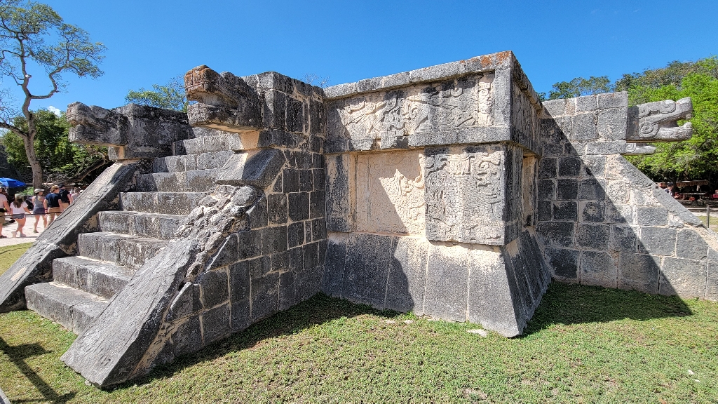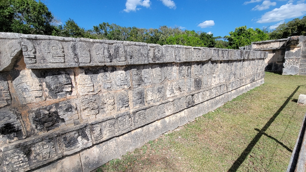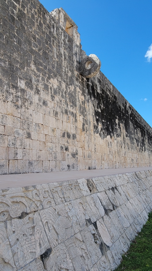 这是离金字塔不远处的一座玛雅人球场,比赛时将球投入对方的石圈就获胜。石圈距离地面大概7、8米的样子,所以进球不容易。输球一方(有考古学家说是赢球一方)的队长会被砍头用来献祭。可能在当时用自己的身体向神灵献祭乃至高无上的荣耀。球场两边的石墙上还刻有球员被砍头的浮雕。