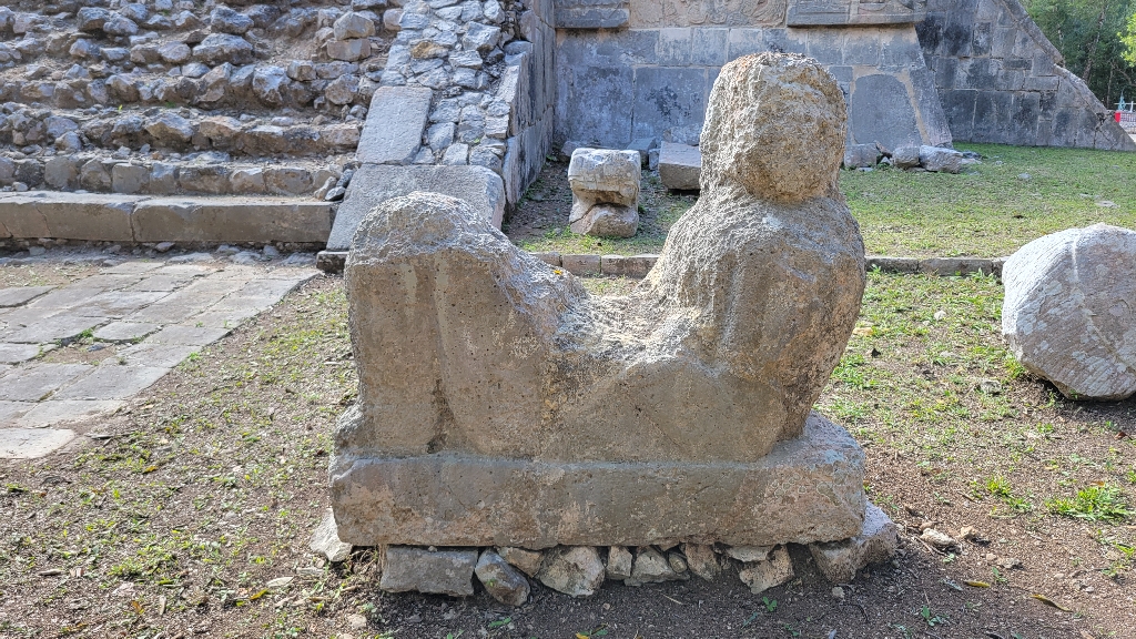 这个人形雕像成半仰卧状,胸前放一容器,据说中美洲很多地方都有类似的雕像,猜测是敬献给诸神的活人祭品,胸前容器用于放置贡品(比如活人心脏),听起来有点毛骨悚然。