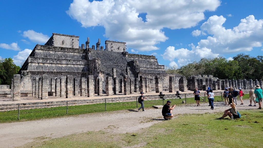 这座金字塔在英语、西班牙语和玛雅语里拥有不同名称,正式称谓叫库库坦神庙,但是我听导游称它为奇琴伊察金字塔。所以怎么称呼也许无所谓吧。金字塔总高大约30米,塔基边长55米,建于公元1000年左右,无论从规模和建造年代来讲都跟埃及金字塔无法相提并论(胡夫金字塔高137米,基座边长230米,建于公元前2600年)。这座金字塔每一面的小台阶有91级,乘以4就是364,加上最上面的小房子,总数是365,象征一年有365天。以前允许游客沿台阶爬到塔顶的神庙,但是后来发生一起游客失足坠亡的事故,从此就不让游客上去了。最新考古发现这个金字塔里面还有一个建造年代更为久远的小金字塔,并且整个建筑是建在一个天坑水池上面!