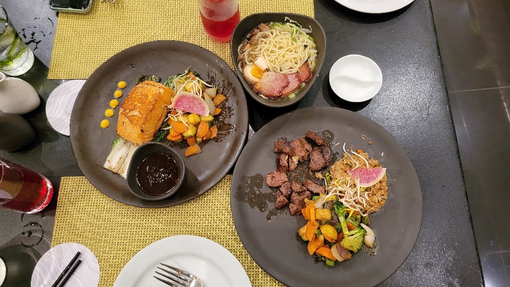 日式亚洲餐馆的晚饭,一份铁板牛肉、一份三文鱼还有日本拉面。