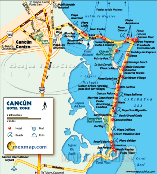 作为一个旅游城市,坎昆遍布大大小小的酒店。其中的高档酒店大多集中在沿岸的7字形区域里。十几公里长的海滩边上光是五星级酒店就有二十来家。