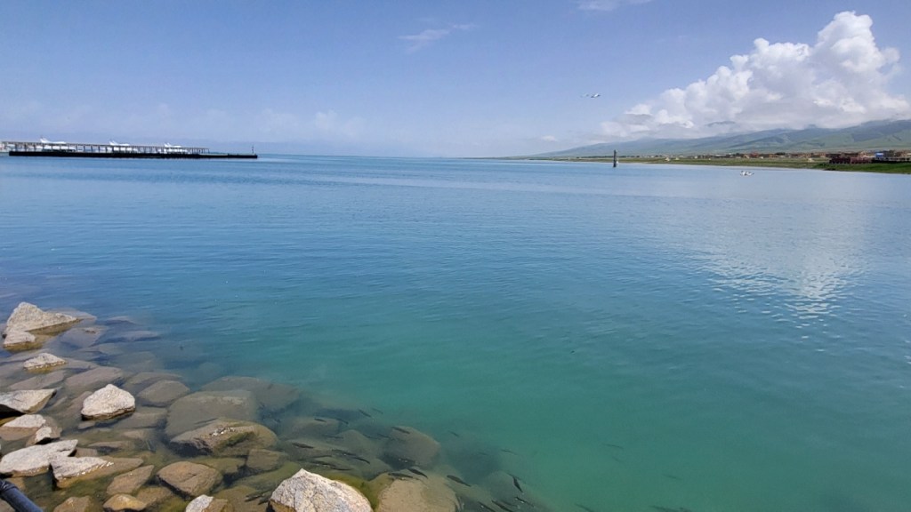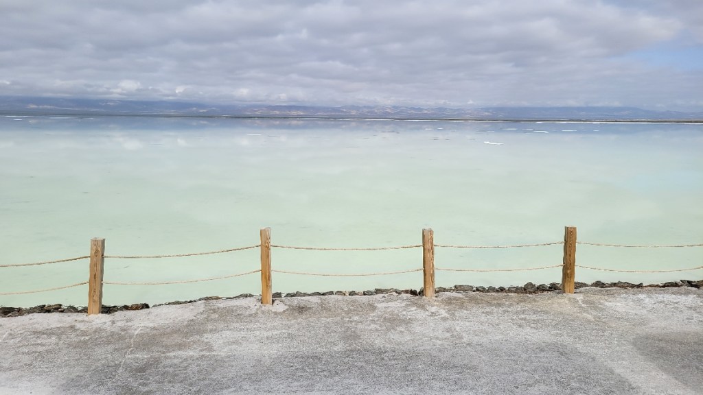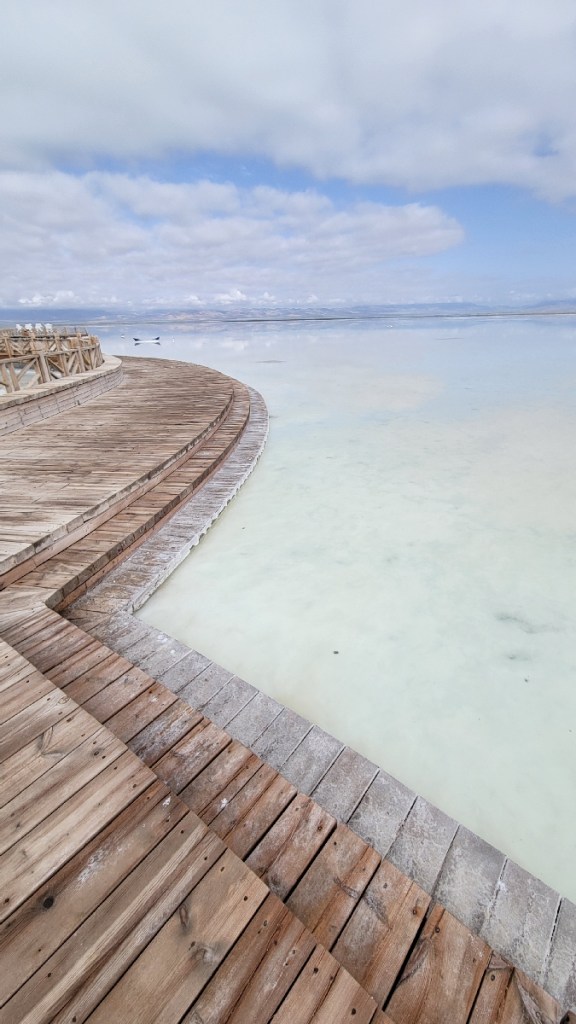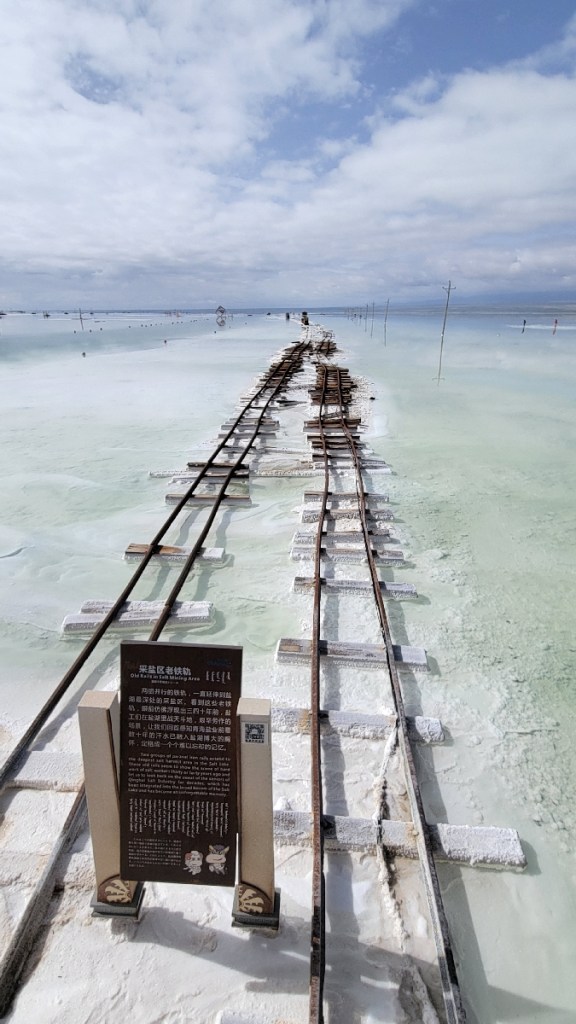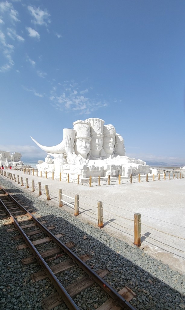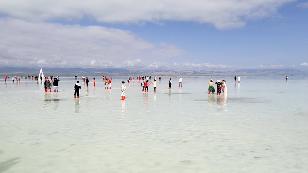茶卡盐湖可以说是中国的Great Salt Lake。虽然比美国盐湖城的大盐湖小很多(茶卡盐湖面积100平方公里,大盐湖面积4千至5千平方公里),但是茶卡盐湖的观赏性比大盐湖要更好,因为湖水盐度很高所以结晶盐随处可见,而且湖水很浅,清澈见底,不像大盐湖那样碧波荡漾跟大海无异。很多游客穿着租来的鞋套在湖里到处行走。要问如若允许的话能否不穿鞋套直接跳进湖里蹚水?我猜肯定不行。茶卡盐湖里的水接近于饱和盐水,或者叫卤水,是海水浓度的七到八倍,对皮肤肯定会有腐蚀作用。据说茶卡盐湖的盐含有95%氯化钠,可以直接食用。而整个盐湖里的盐可供全中国人食用100年!