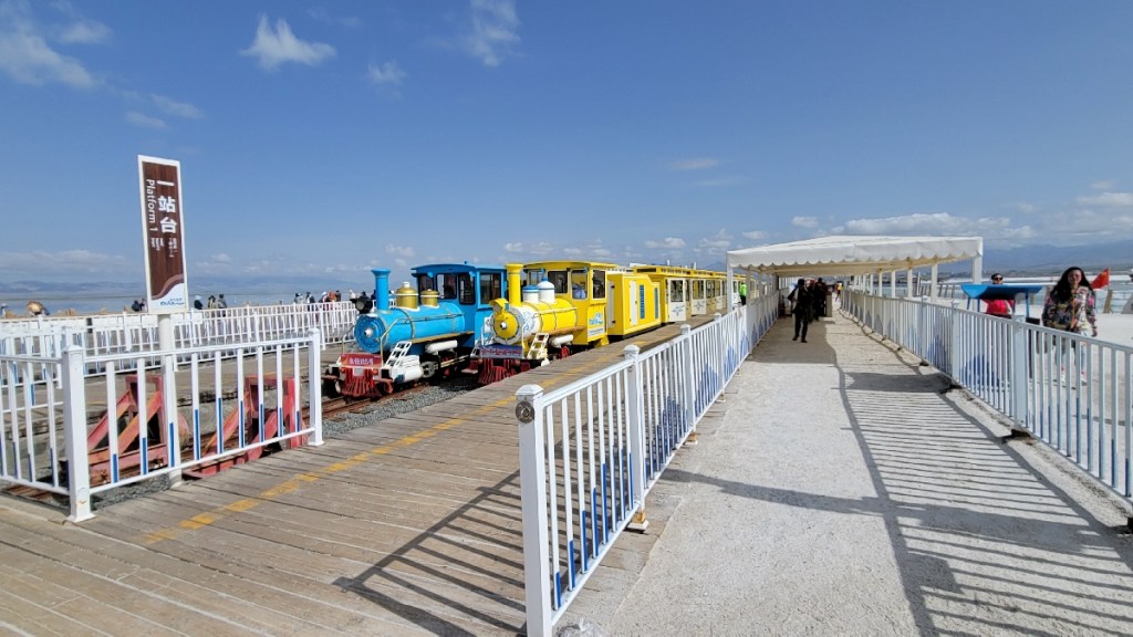 茶卡盐湖在我的行程单里本来只是去青海湖路上顺道参观,并没有作为一个主要景点来准备,所以事先攻略做得很不到位。岂止不到位,根本就没有做。早上动身的时候,跟老妈解释了一下当天的大致行程,预想着吃完早饭就去附近的盐湖,在湖边停留几分钟看一眼湖景(心想不就是个小湖嘛,顶多一个小时就能搞定)。然后就离开此地径直去青海湖了,那才是当天的首要任务。我这么想的时候,肯定是没有用心,沿用了长年养成的惯性思维了。事实上,盐湖这一去就花了大半天,远远超出了预计的时间。进了景区后先坐摆渡大巴,然后下车再坐观光小火车,在蜗牛一样的行进速度下慢腾腾花二三十分钟才到达通往湖心的终点,其实前后距离也就几公里而已。跟其它景点类似,宰人没商量。在游客中心需花60元买门票入盐湖景区,所幸摆渡车是免费的,但是观光火车车票单次50元,这样来回就是100元的车票。另外停车费10元。算下来仅仅是为了看一个盐湖每个游客的花费就至少160或者170了,还不包括租鞋套和坐游船的费用,令人咂舌。老人可以免60元景区门票,但是其它费用一概不能免。还有高速路收费,其它省份的标准大致在每公里0.5元以下,但青海有些地段的收费按我的估算高达每公里1元以上,颇有乱收费的嫌疑。柴达木盆地的地势其实很平坦,虽然地处高原,但基本不需要架桥打隧道,收取高额买路钱的唯一理由大概是人烟稀少、道路利用率低的缘故。