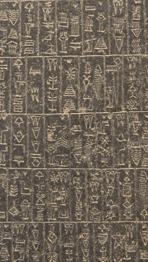 那么,田字的远古意义为什么极有可能就是兽或者猎呢?答案也许就在下面这张照片里。这是我去年夏天在卢浮宫里看到的4500年前阿卡德(Akkad)人使用的楔形文字。