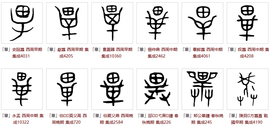 毕(畢):汉语一级通用字,DeepSeek 和 ChatGPT 都说在甲骨文里有这个字,并说其字形描绘了古代捕猎用的长柄网具,主要用于捕捉鸟类和小型动物;该字在甲骨文中不仅表示具体的工具,还引申为“完成”或“结束”的意思,云云。但我没有找到畢的甲骨文,只找到了金文,见下图。很明显,畢的金文写法分上下两部分,上面是一个田,下面是一个网状的器具或者叉子。这里的田跟农田完全不沾边,不管捕捉到的是鸟还是其它什么动物,100%肯定是 广义上“兽”的意思(或小兽,或大兽)。因为这个兽已经被捕捉到了网兜或者叉子里,所以后来引申为“完成”。