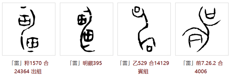 西周金文里的雷写成以下的形状。金文出现的年代虽然比甲骨文略晚,由甲骨文演化而来,但有观点认为金文里的某些字保留了比甲骨文更原始的图形特征,线条笔画也更加繁复,而甲骨文则是对其进行了简化。雷字有可能就是其中一例。