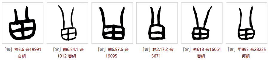曾: 汉语一级通用字,在甲骨文里是下面一个田字上面一个八字,有人指出它代表分割牲畜的祭祀,我查阅了《甲骨文字典》,里面也认可“曾”作为祭祀的一种解释。但通行说法是曾字的田代表蒸锅或炊具,上面的八字形代表蒸汽上升,我对此只能表示呵呵了。即便八果真代表蒸汽,底下的田也不会是蒸锅,而多半是被蒸煮的牲畜或猎物。这里田代表兽的可能性我认为至少有60%。