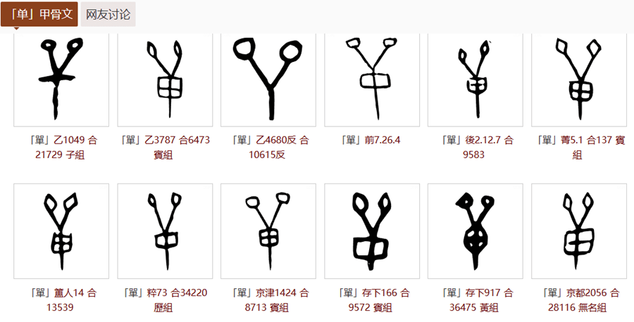 单(單):汉语一级通用字,在甲骨文里是一个叉子的形状,有时候中间有个田字,见下图。它有多重意思,有时指代捕猎工具,表示用叉子一样的工具来捕猎。说文解字把单字解读成“大”,我就不妄评了,多半是许慎没有见过甲骨文因而不懂单字本意的缘故。这里田代表兽的可能性至少有90%。有学者认为后来單加上戈分化出戰(战)字,所以單是戰的本字。另外,弹(彈)也是如此。