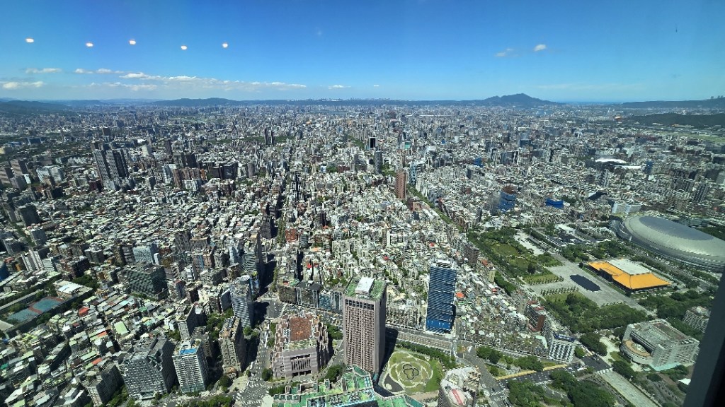 从101大厦第89层观景台俯瞰台北。101高500米,是台湾最著名的地标,2010年之前曾是世界第一高楼。在台湾这种地震多发地区建造这么高的摩天大楼要有非凡的勇气。站在观景台上远眺,中央山脉、基隆河、淡水河入海口、阳明山、圆山饭店、桃园一览无余。