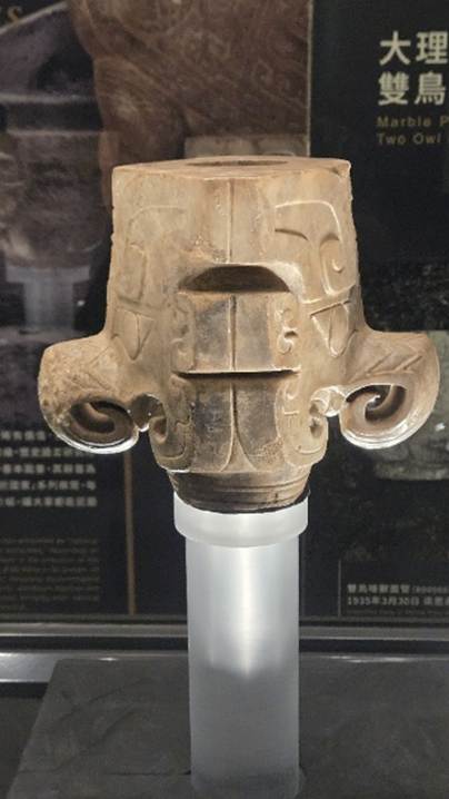史语所最大的成就无疑是对殷墟的发掘,全面颠覆了当时史学界对中国古史的认知。其发掘出来的文物当然大部分都交了公粮,由故宫这些更高一级机构收藏。但史语所自己依然保留了大量文物。比如这个大理石双鸟喙兽面管。据推测大概是商代建筑里套在木椽上的装饰物。